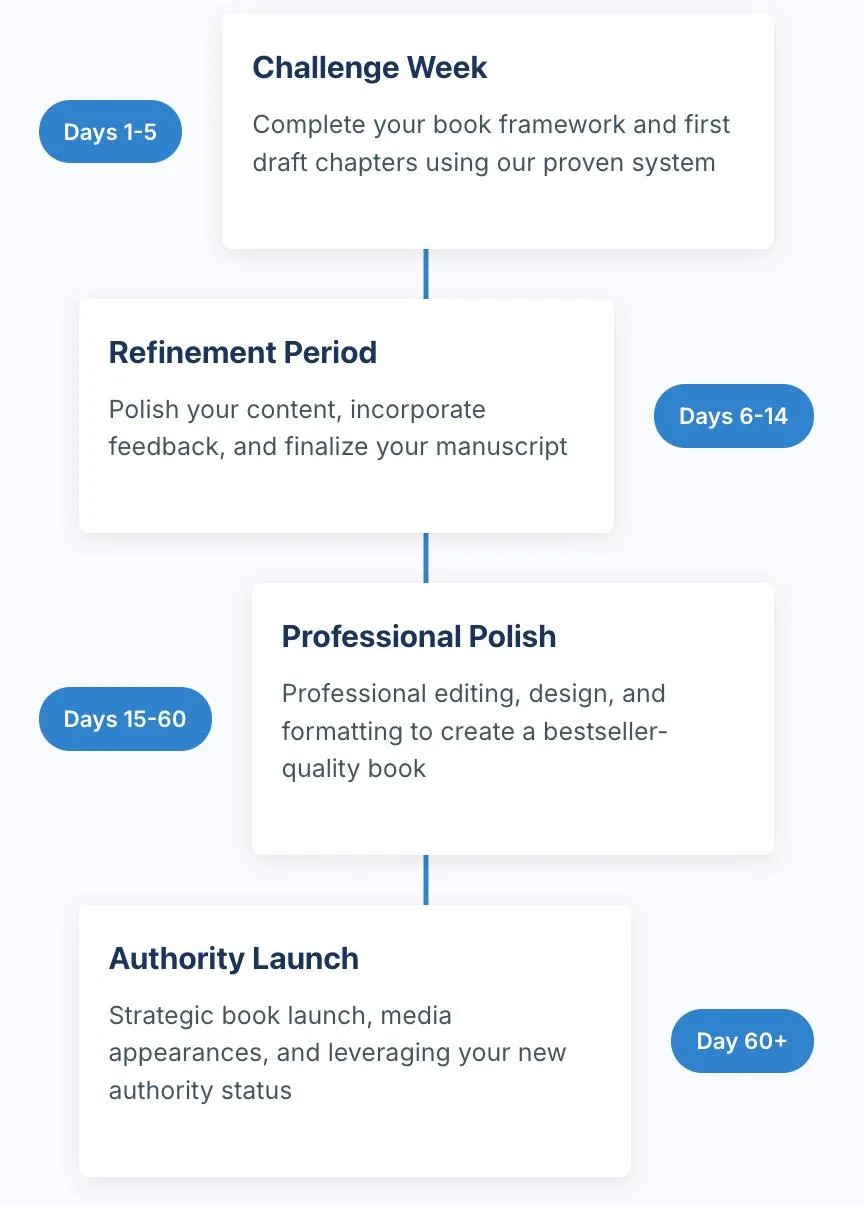 The challenge takes just 1 hour per day for 5 days. By Day 5, you'll have a complete lead-gen book framework that can be finished in weeks, not years. Most participants are amazed at how much they accomplish in just 5 days.